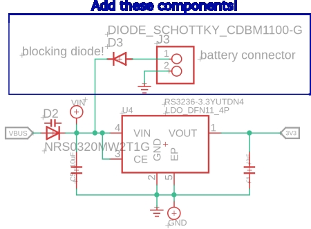 The blocking diode is required on the Samd21 and RP2040 boards to ensure that current can flow out of the battery but not into it. Without this diode having the USB C cable plugged in to charge/program while the battery is plugged in will at best destroy your battery and at worst light it on fire! The diode and connector must be added externally on your PCB before connecting to the bottom Vin pin of the Xiao.